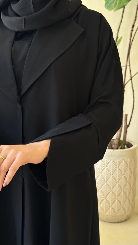 تألقي بإطلالة تعكس ذوقك الرفيع مع عباية بأزرار السوداء المصنوعة من قماش الأناقة أبو جمل الفاخر، الذي يجمع بين المتانة والنعومة والانسيابية ليمنحك راحة وأناقة تدومان طوال اليوم. تأتي العباية بتصميم كتف بسيط يبرز أنوثتك الراقية دون مبالغة، مع تفقيلة أزرار طقطق مخفية تضيف لمسة خفية من الفخامة والأناقة في كل حركة.